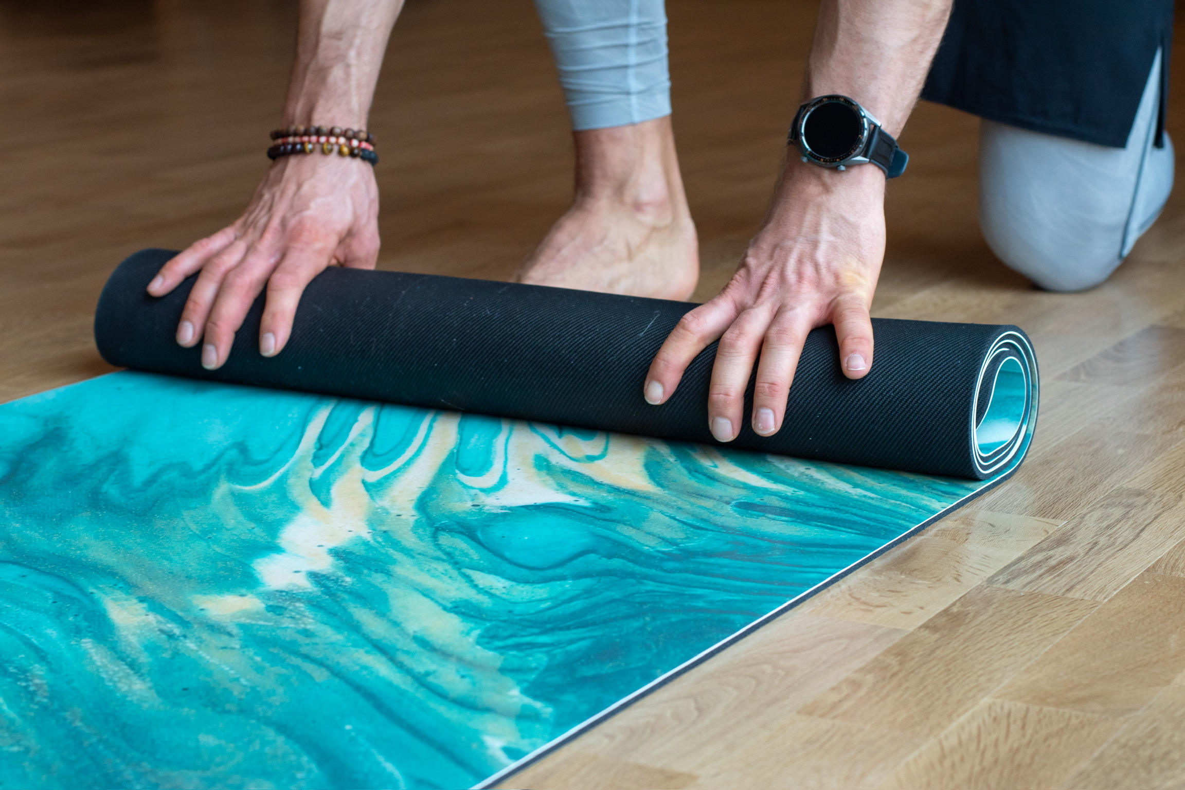 En caso de que durante el entrenamiento sudes muy poco o al inicio de la práctica, cuando las manos y pies aún no están húmedos, recomendamos rociar el mat con una pequeña cantidad de agua.