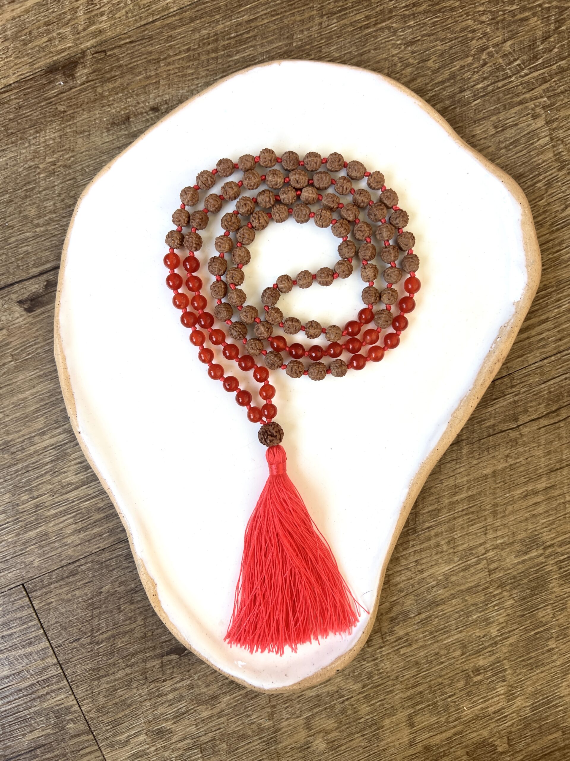 La Japa Mala de ágata roja combinada con rudraksha es una pieza llena de fuerza, vitalidad y conexión espiritual. No es solo una herramienta de meditación: también es un talismán, un amuleto y un accesorio con intención que puedes llevar a diario.