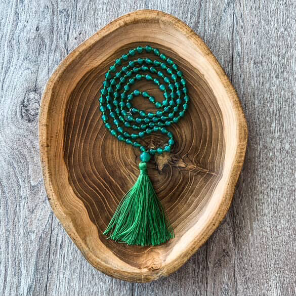 La japamala se usa comúnmente para repetir mantras: vas pasando cada cuenta con los dedos, acompañando la respiración o la repetición de la mantra. Tradicionalmente se utilizan 108 cuentas, pero no es obligatorio. Puedes hacer una meditación corta, detenerte solo en algunas respiraciones o recorrer solo una parte del collar. Lo importante es tu intención, no el número.