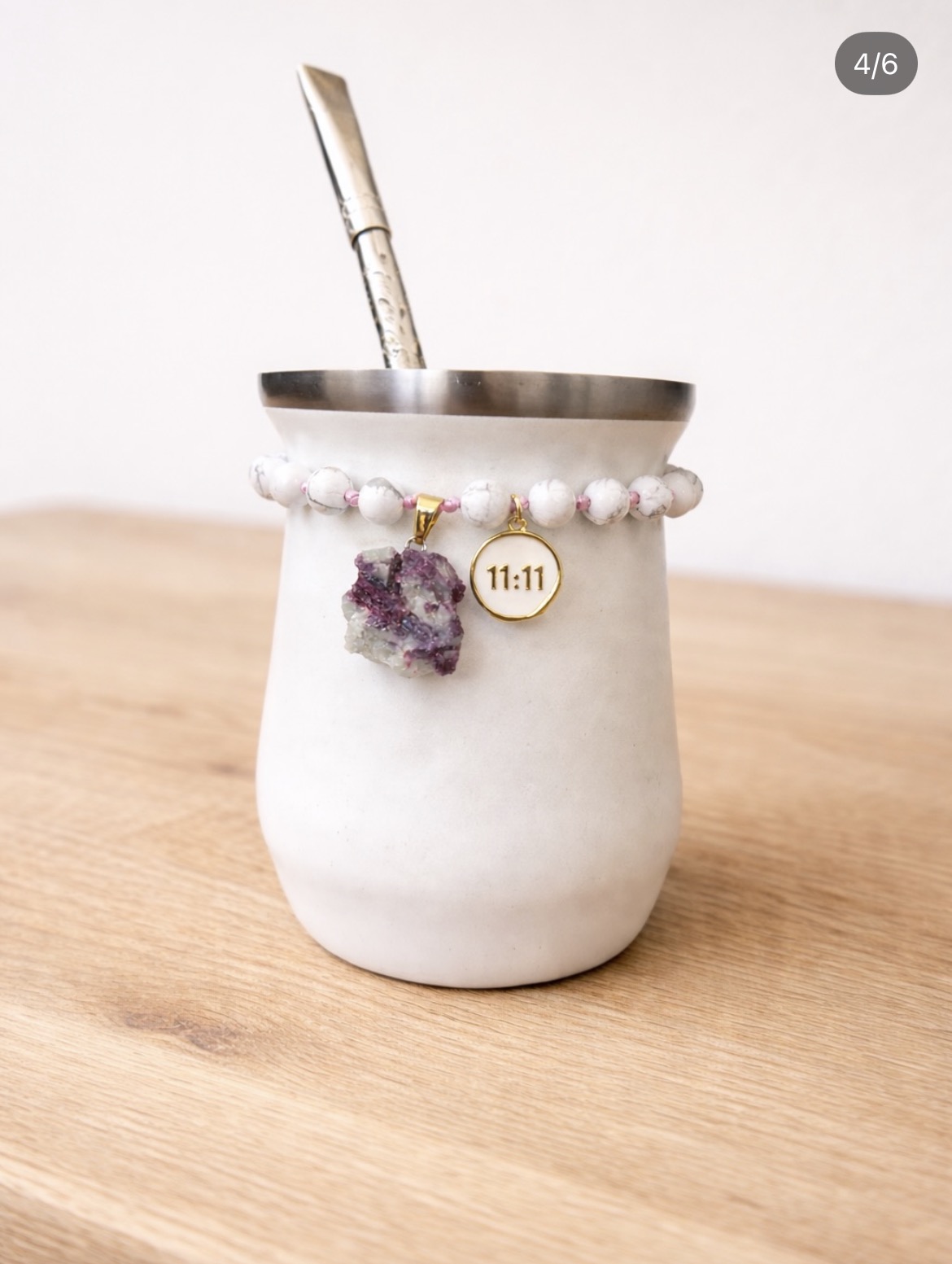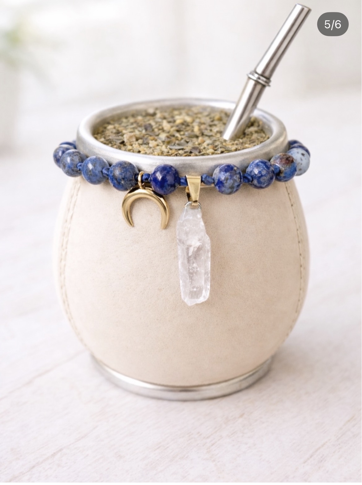Este talismán está elaborado con piedras minerales y cristales, y puedes llevarlo contigo a donde vayas junto a tu mate. Es un detalle personal que se cuelga fácilmente y te acompaña en tu día a día.